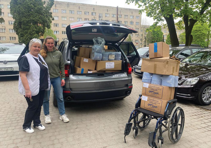 Madeline’s daily work ranges from speaking to English and Ukrainian donors, creating project proposals, finding funds anywhere she can. She wades through paperwork to get aid into the country – and can be found in the warehouse boxing up supplies, loading vans and sorting out what is coming in and what is going out.