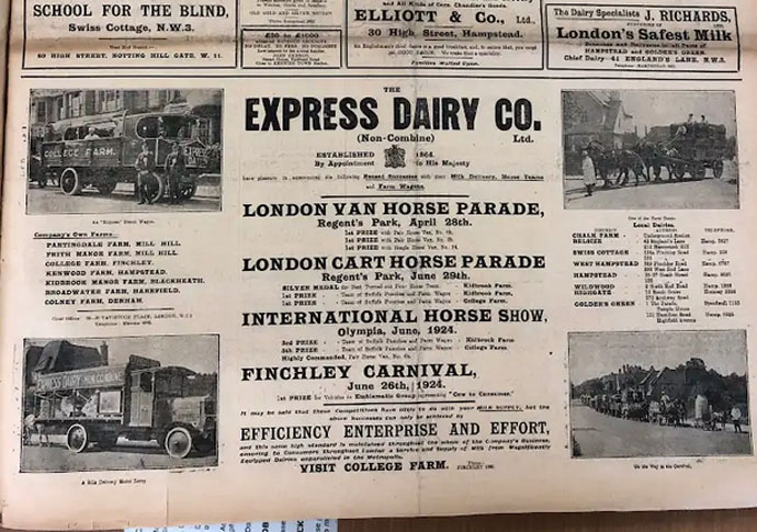 Newspapers carried a front page of adverts: the Ham & High of Saturday July 12 saw Express Dairies promote the London Van Horse Parade in Regent’s Park. It shows how the working horse was part of London culture, with milk delivered by horses based in Kenwood. Sidney Day, whose memoir London Born describes working-class life, recalls the Kenwood horses were so tame that youngsters would ride them bareback.