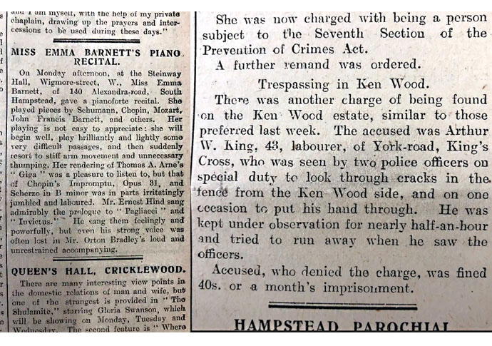 The St Pancras Chronicle reports on a trespasser in Kenwood and highlights how break-ins to the grounds are frequent. In this case, labourer Arthur King from King’s Cross was fined 40 shillings.