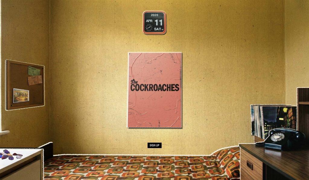 The advert is a photo of a room with a pin board showing two tickets, a pile of albums, a clock depicting Saturday’s date, some guitar picks on a table, a telephone on a desk and the name The Cockroaches with a link to sign up for further information.