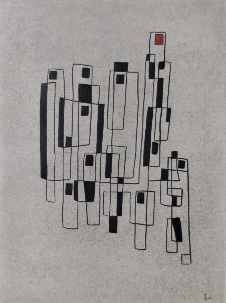 “Much of Patrick’s work is still about imprisonment: the stark outline of an architectural prison footprint; black bars slashing across a face. A recurring image is a red box surrounded by black, which represents the unceasing red light the guards kept turned on all night when Patrick was held in solitary confinement. Red also represents hope – it is strength, it resists the dark.”