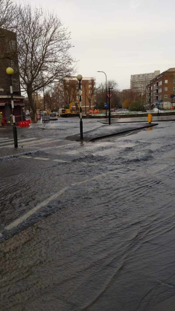 The 800-metre free-flowing stream of water, waste deep in the dip in Belsize Road around some points, has been caused by a 42-inch water main burst.