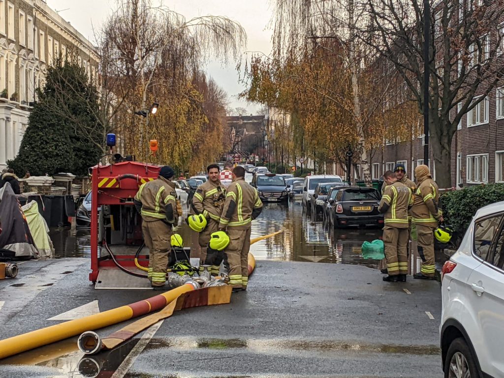 The London Fire Brigade said it was using flood barriers and a high volume pumping unit to divert the water that was around 4pm this afternoon (Saturday) still cascading down Belsize Road from the roundabout to almost the junction with Abbey Road.