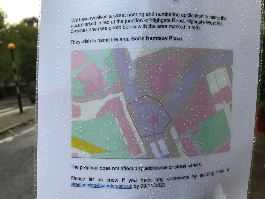 Camden has marked an area at the junction of Highgate Road, Highgate West Hill and Swains Lane to be ‘Boris Nemtsov Place’. It is close to the long term offices of the Russian Trade Delegation.
