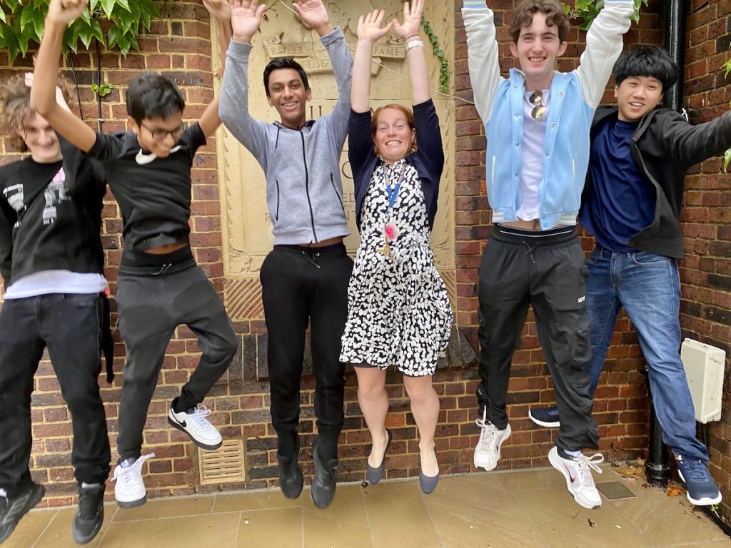 Jumping for joy after results: Daniel Dean, Shalin Chada, Muhainnul Islam, headteacher Izzy Jones, Xander Russell, Ethan Luong