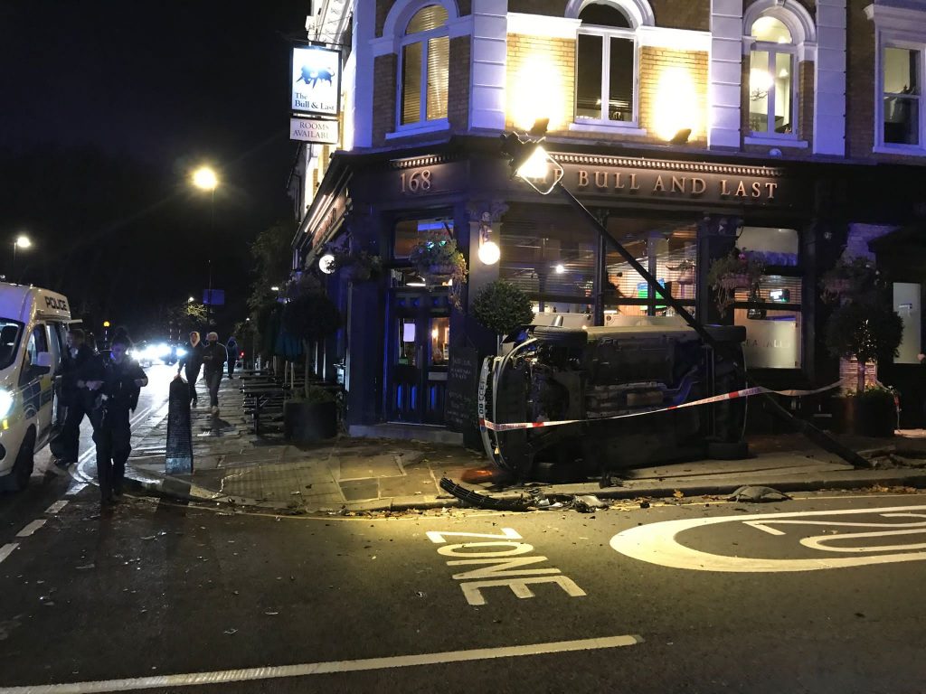 It was claimed two people climbed out of the upturned car, which was left with its engine running and on its side, and ran towards Hampstead Heath.