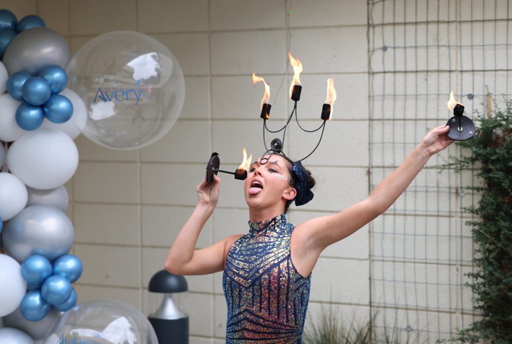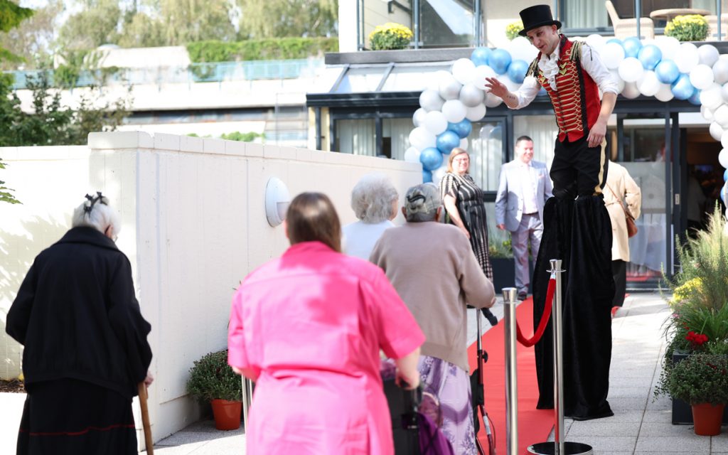 Friends, loved ones, community supporters and professionals received a red carpet welcome, enjoying complimentary arrival drinks and canapés whilst a live pianist performed. The weather was on the home’s side as the grand opening extravaganza began in the garden where residents and guests marvelled at entertainment from a stilt walker, juggler, magician, and fire eater.