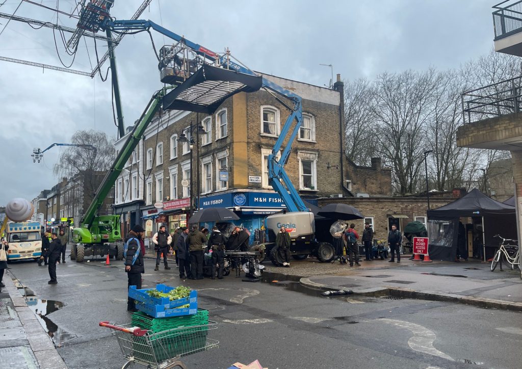 The crews also temporarily covered up the wavy line street art in the market road. Towering cranes were moved in, alongside floodlights and an artificial rain machine on Monday and Tuesday – even though it was already bucketing down. The road was closed to traffic for 11 hours each day as filming continued.