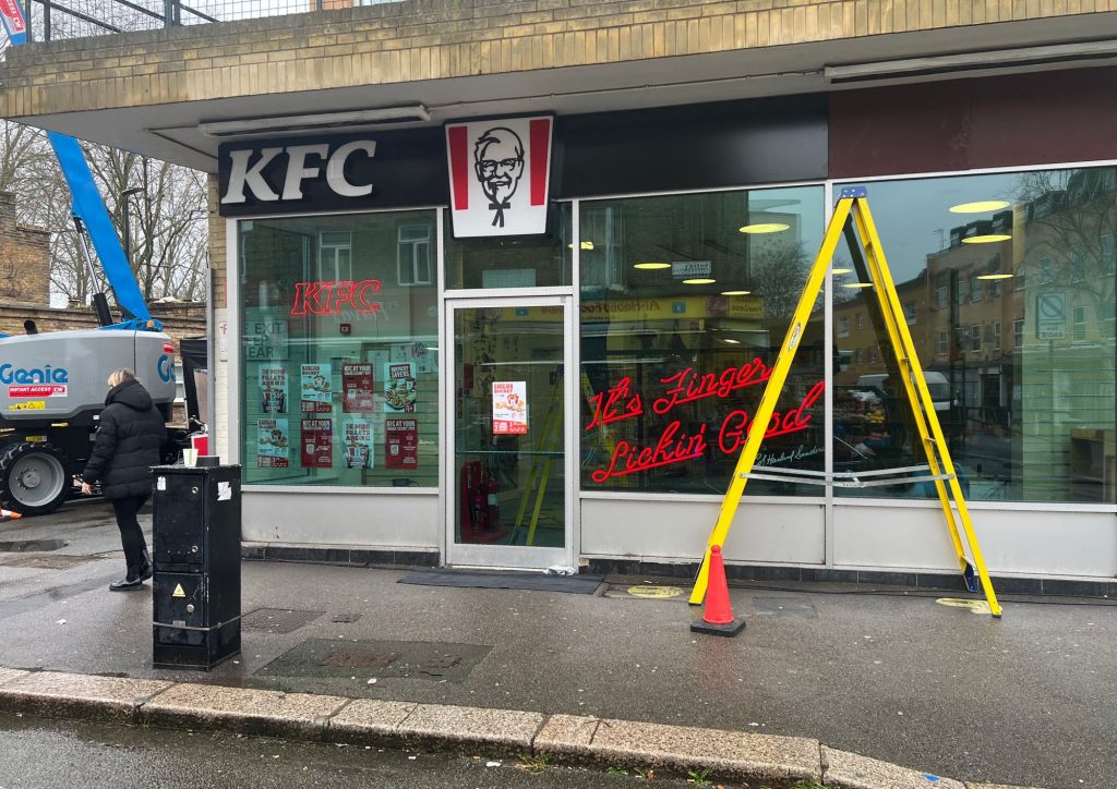 The transformation unfolded as Kentucky Fried Chicken were given permission to film one of its wacky TV adverts, with the library mocked up as one of its branches. The familiar book display in the front window was swapped for neon lights promoting the fried food, with the children’s section closed from 2pm till 6pm on March 12.