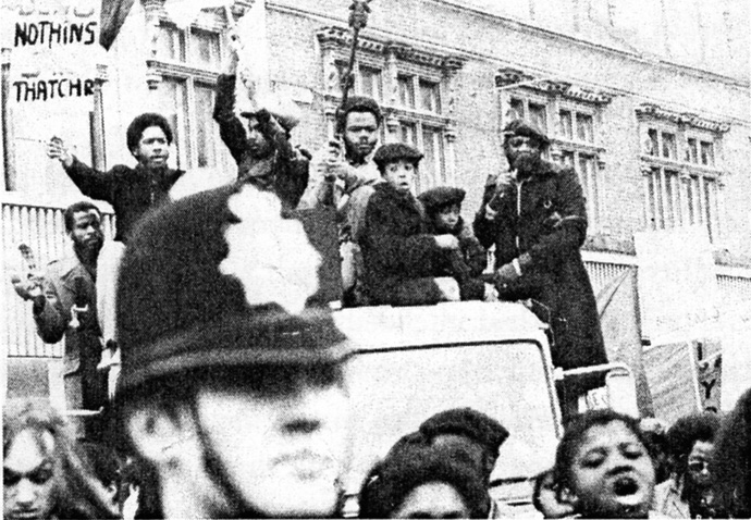 Darcus leading the demonstration on the Black People’s Day of Action, March 2 1981. He is pictured accompanied on the truck by two of his sons, Darcus Jr and Rap