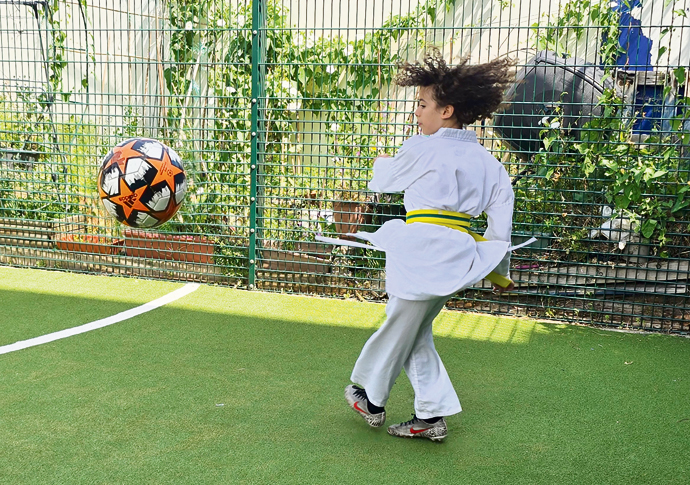 “On the other half of the pitch there would be children playing football, and whenever I watched them shoot, they would miss the goal. So I thought if I could incorporate football drills into my taekwondo sessions, all the kids could train together, and maybe they would improve in both. The idea just came to me.”