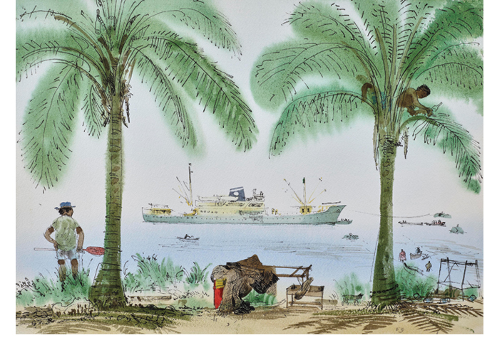 Nauru Phosphate freighter and palm trees, 1976