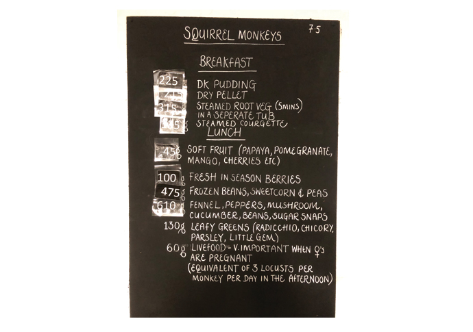On the walls are the menus. We learn gibbons are partial to sweet potato, while the Diana monkeys can’t digest onions. Squirrel monkeys like steamed vegetables and for an afternoon treat, they nibble live locusts – with the instructions that any pregnant members of the troupe must have at least three.