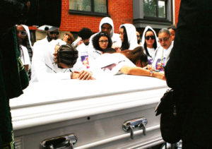 THE tearful family of a young man who was shot dead in Holloway draped their arms over his coffin before a funeral procession joined by hundreds carried his body through the streets he grew up in.