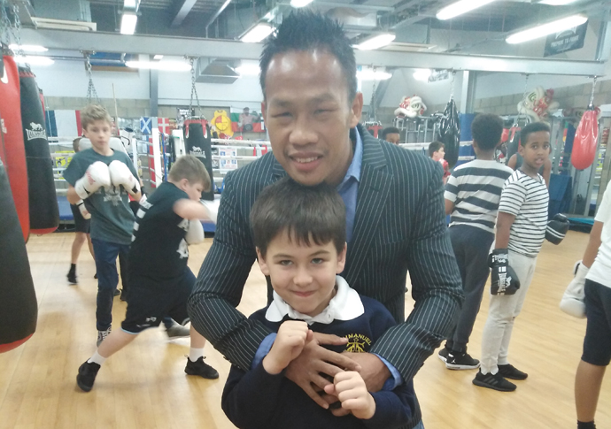 Former world champion Daud ‘Cino’ Yordan poses with young boxers and coaches at St Pancras ABC in Kentish Town