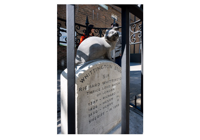 The Whittington Cat has been perched atop the Whittington Stone since 1964, inspired by the rags-to-riches story of poor 14th-century orphan turned wealthy merchant and Lord Mayor of London, Richard “Dick” Whittington.