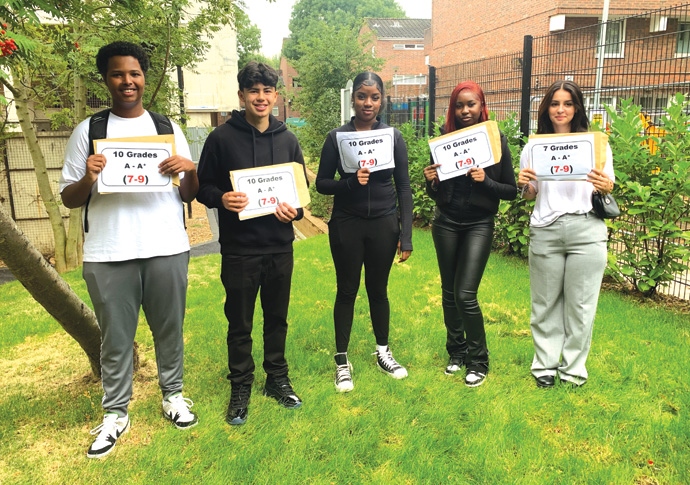 City of London Academy, Highgate Hill, students display their scores: Younus Abib, Alfonso Ortiz Guzman, Cori-Ann Goulbourne, Sophie Igbinoke-Joseph and Jessica Sujeta-Metushi