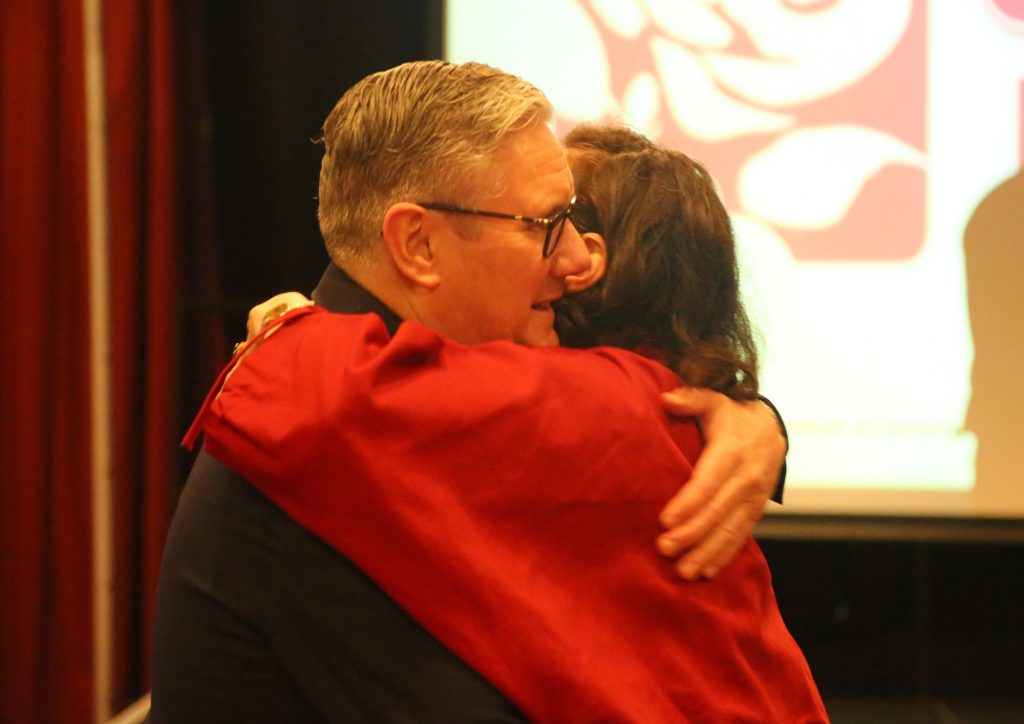 Sir Keir Starmer gets a hug from Livia Paggi, a new candidate in Holborn and Covent Garden