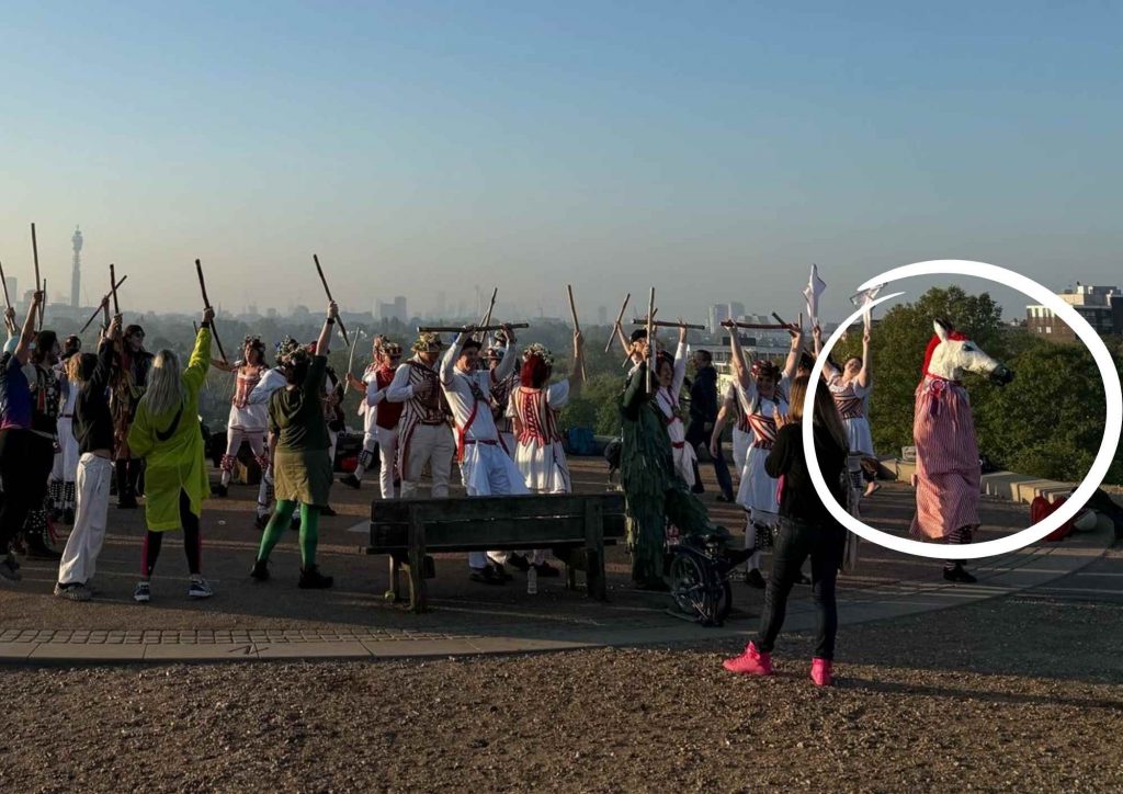 Thousands of Morris troupes across the UK observe May 1 with reverence and were up at first light, but few would have seen the sun rise to such a glorious backdrop – nor somebody in a horse costume chasing them around.