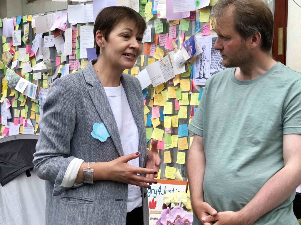 Green MP Caroline Lucas at the protest camp and, below, Hampstead and Kilburn MP Tulip Siddiq speaks to international press cameras