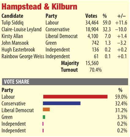 Neck and neck? Tulip Siddiq holds Hampstead and Kilburn with five-figure majority