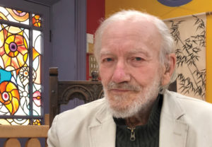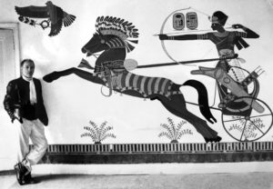 Dave Tomlin inside the squat standing beside a mural he copied from a postcard he discovered at the British Museum