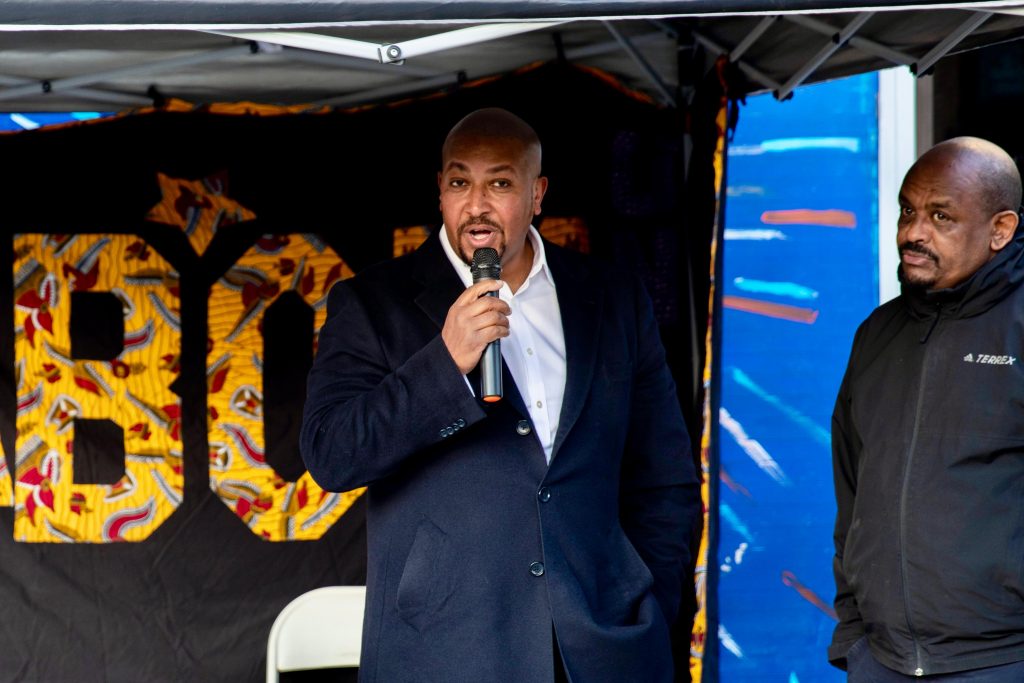 Nahom Mehanie’s father spoke briefly and, below, event organiser Frank Biney (right) who runs pan-African organisation Nkabom Group