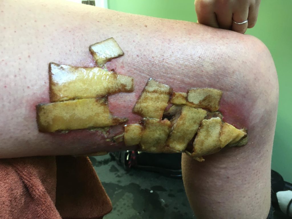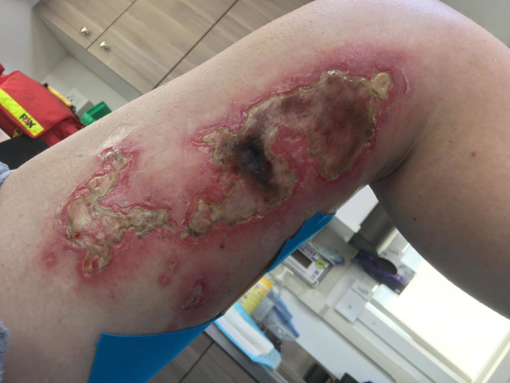 His colleague Alex Woollard removed dead tissue on her leg and placed a skin graft over the top. Following two operations and six nights in hospital, she is recovering – but still needs to go to hospital every two days to have her dressing changed.