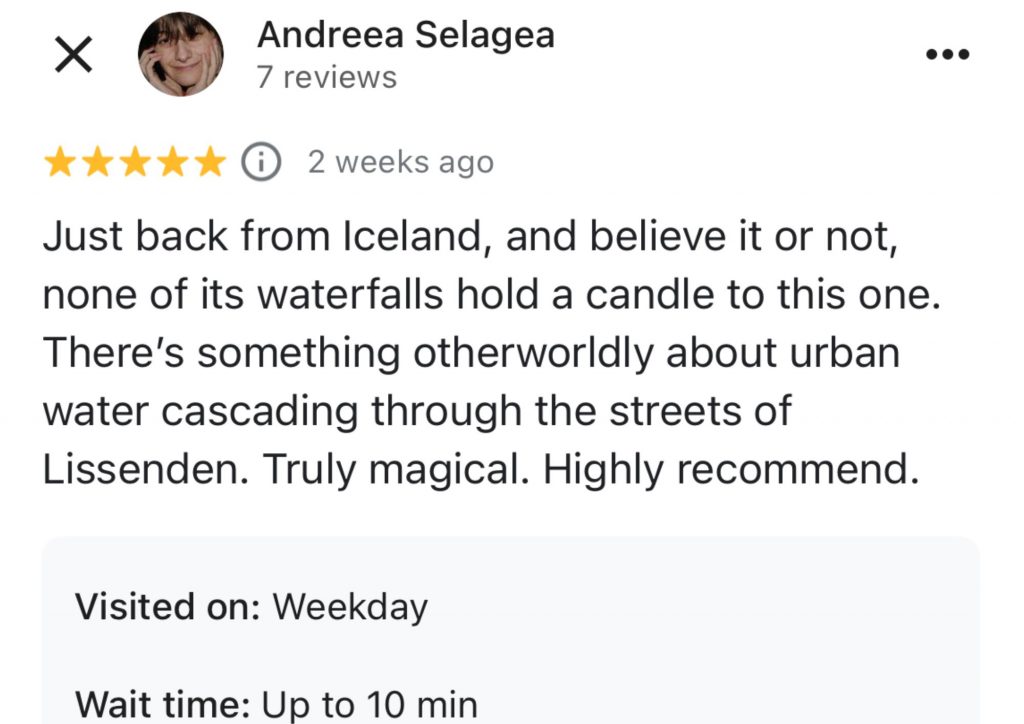 To Ms Papava’s surprise people have been leaving reviews of the “Lissenden Waterfall”, seven in total – with one five-star review saying: “Just got back from Iceland, and believe it or not, none of its waterfalls hold a candle to this one. There’s something otherworldly about urban water cascading through the streets of Lissenden. Truly magical. Highly recommend.”