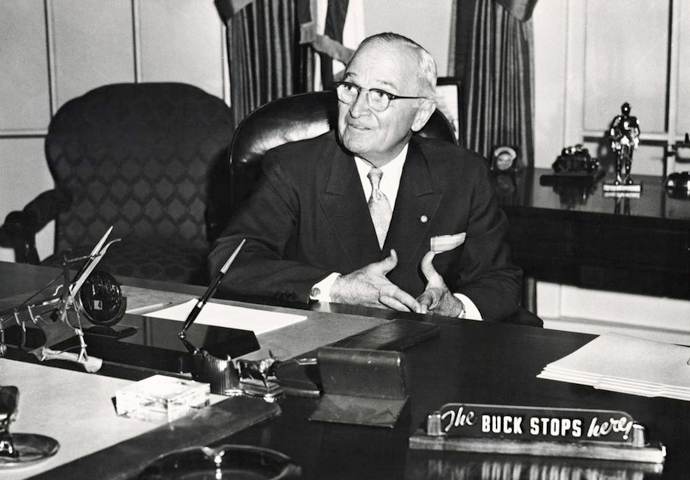 Truman at his desk with ‘The Buck Stops Here’ sign