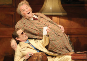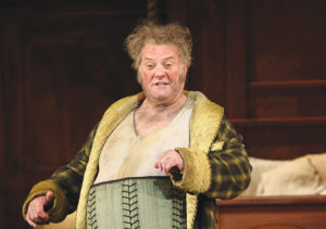 He’s cloyingly mawkish, nursing a dreadful hangover in the opening scene, dressed in stained one-piece jim jams, examining the bill for the previous night’s revelries with Pistol and Bardolph. Next, he’s dressed in swanky tweeds, breeches and all, plotting amorous advances on Alice and Meg.